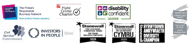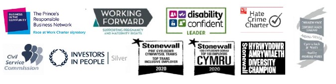 Logos: Civil Service Commissioners, Investors in People Silver, Healthy Working Wales Corporate Health Standard Silver