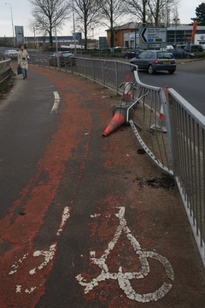 9.3 Where footways are designated as shared use, cyclists will be present on the footway and this creates a potentially dangerous situation where both pedestrians and cyclists are restricted to a narrow width past a vehicle obstruction.