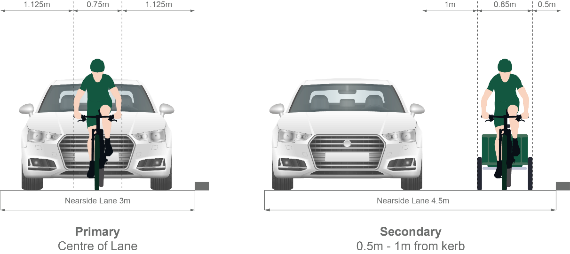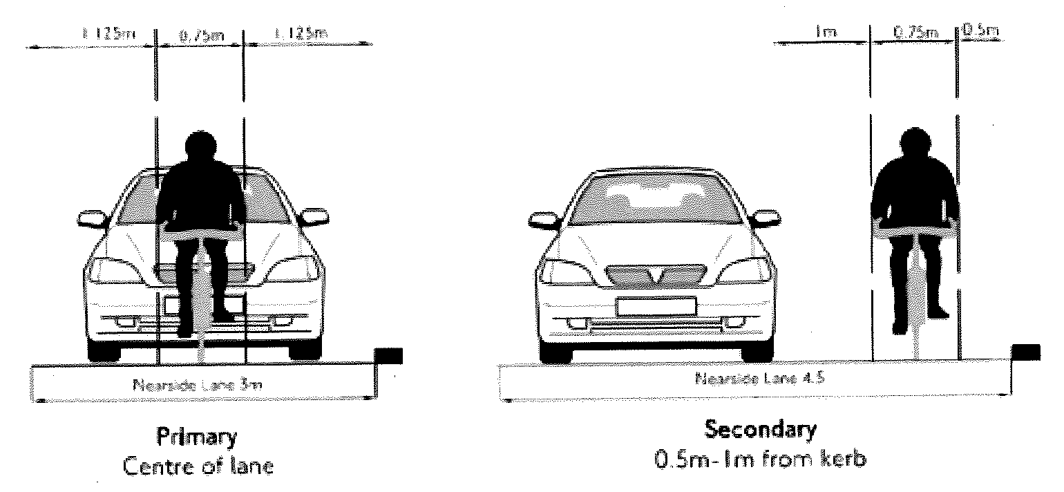 20.6 The available lane widths will determine whether the cyclist proceeds in the primary road position or the secondary road position. The primary road position is where the cyclist rides in the centre of the lane within the traffic flow. This is necessary for lane widths of 3m and less. The secondary road position is where the cyclists rides 0.5m – 1.0m from the edge of carriageway and there is sufficient space for vehicles to overtake. This is achievable for lane widths greater than 4.0m. Traffic management should not be set out with lanes widths between 3.2m and 3.9m as drivers will be tempted to pass cyclists with insufficient clearance. In such cases it should be made clear with signage that it is not permitted to overtake cyclists.