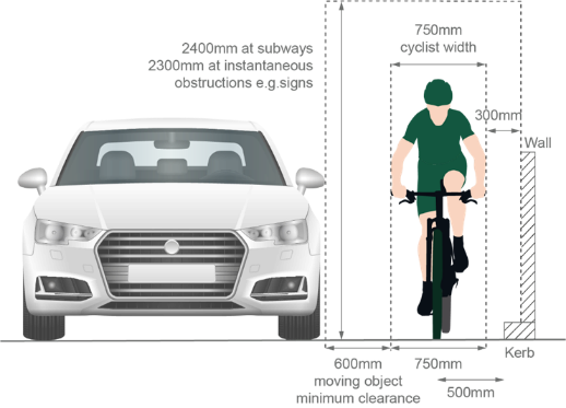 20.11 The works promoter should be mindful of the space required for cycling as physical barriers such as pedal height and handlebar height can be especially hazardous. Extra width should be provided to ensure sufficient clearance. Detailed information on space required for cycling is set out in 12.17, 12.18 and 12.19 of the Active Travel Act Guidance.