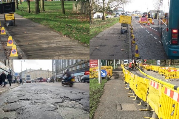 Photos anticlockwise: 1. road signs on the public footway 2. temporary bus stop using signs and bollards on or in the road footwell 3. poor road surface 4. excavation works taking place next to the road, narrowing the pavement.