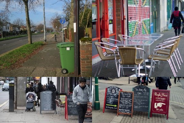 Photos clockwise: 1. rubbish bin obstructing pavement 2. Tables and chairs outside a cafe on public highway 3. sign cluttered footways 4. Photo signs obstructing public footways.
