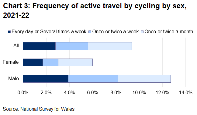 When asked how frequently they had used a bicycle as a means of transport in the previous three months, men were significantly more likely to cycle, and to do so more frequently than women (Chart 3).