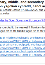 - Percentage of primary, middle, and secondary school pupils who have a home postcode in the 20% and 40% most deprived areas of the Welsh Index for Multiple Deprivation (WIMD) 2019, at February 2022