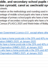 - Percentage of primary, middle, and secondary school pupils who have a home postcode in the 20% and 40% most deprived areas of the Welsh Index for Multiple Deprivation (WIMD) 2025, at January 2025