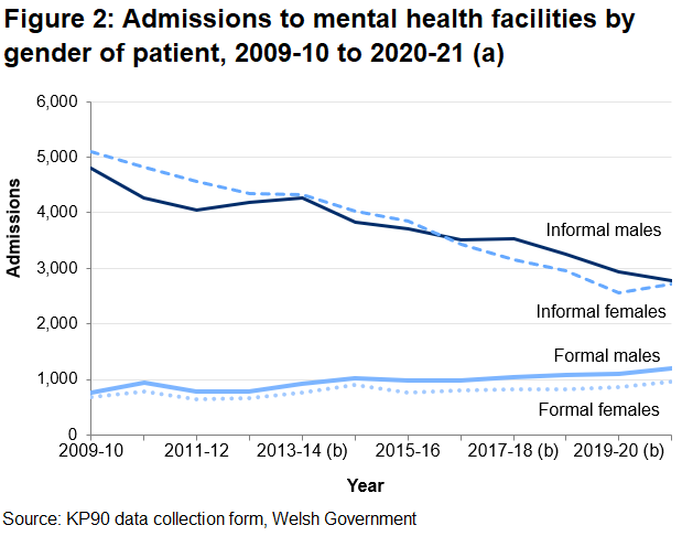 Information is presented on both formal and informal admissions to mental health facilities in Wales (including NHS and independent hospitals). Although informal admissions account for the majority of admissions to mental health facilities in Wales, in the interest of their own health or safety, or for the protection of other people, a person may be formally admitted or detained in hospital under various sections of the Mental Health Act 1983 and other legislation.