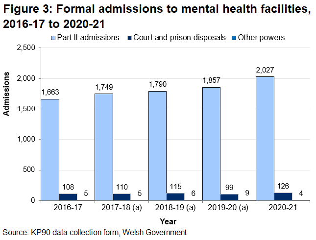 The number of formal admissions under sections of the Mental Health Act has increased each year since 2016-17. This increase has been driven by an increase in those admitted under Part II (Part II of the Act allows a patient to be compulsorily admitted under the Act if they are suffering from mental disorder as defined in the Act). Of those admitted formally, the large majority in each year were admitted under Part II (94% in 2020-21).