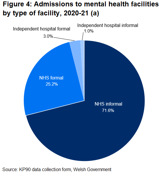 In 2020-21, the proportion of admissions that were informal ranged from 62% in Betsi Cadwaladr to 84% in Cwm Taf Morgannwg. 96% of admissions to independent hospitals were formal admissions.
