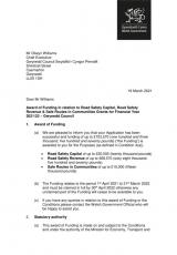 A copy of the award letter for the Safe Routes In Communities scheme submitted by Cyngor Gwynedd.