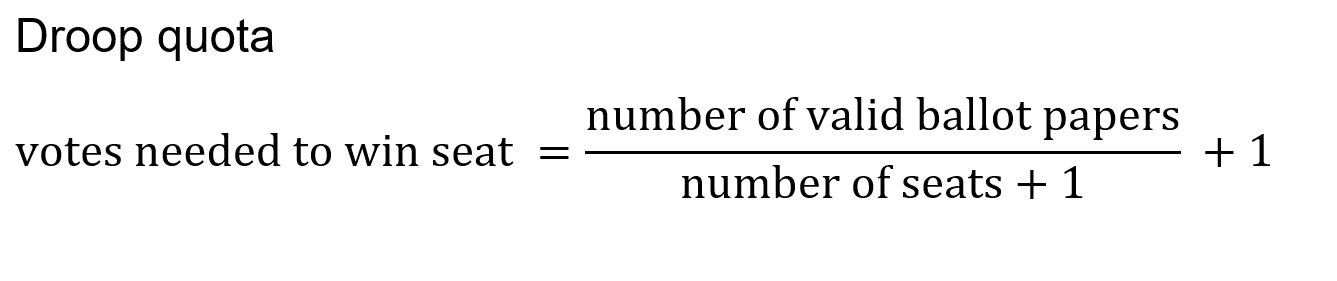 A key exercise in the counting of votes under STV is the calculation of the “quota,” which is the threshold of votes required for the election of a candidate. The research we commissioned focused on the use of two quota variations: the “Hare quota” and the “Droop quota,” which each use the number of ballot papers cast that are valid and the number of seats available to be filled to calculate the quota, shown below.