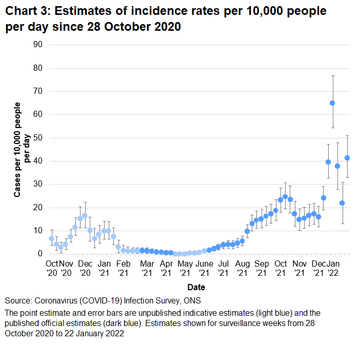 In Wales, in the week up to 22 January 2022, it is estimated that there were 41.25 new positive coronavirus (COVID-19) cases per 10,000 people per day (95% credible interval: 32.98 to 50.97).