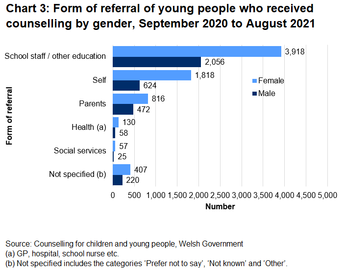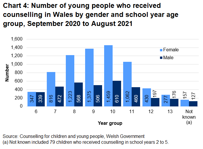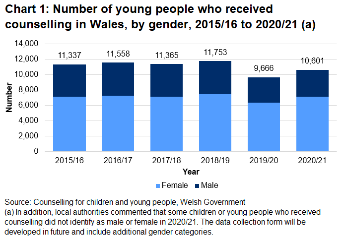 - 10,601 children or young people received counselling services in 2020/21, up by 10% compared with 2019/20, but down compared with the years prior to the coronavirus (COVID-19) pandemic. School closures between March and August 2020 and January to March 2021 due to the pandemic are likely to have had an impact on the figures in these two years.