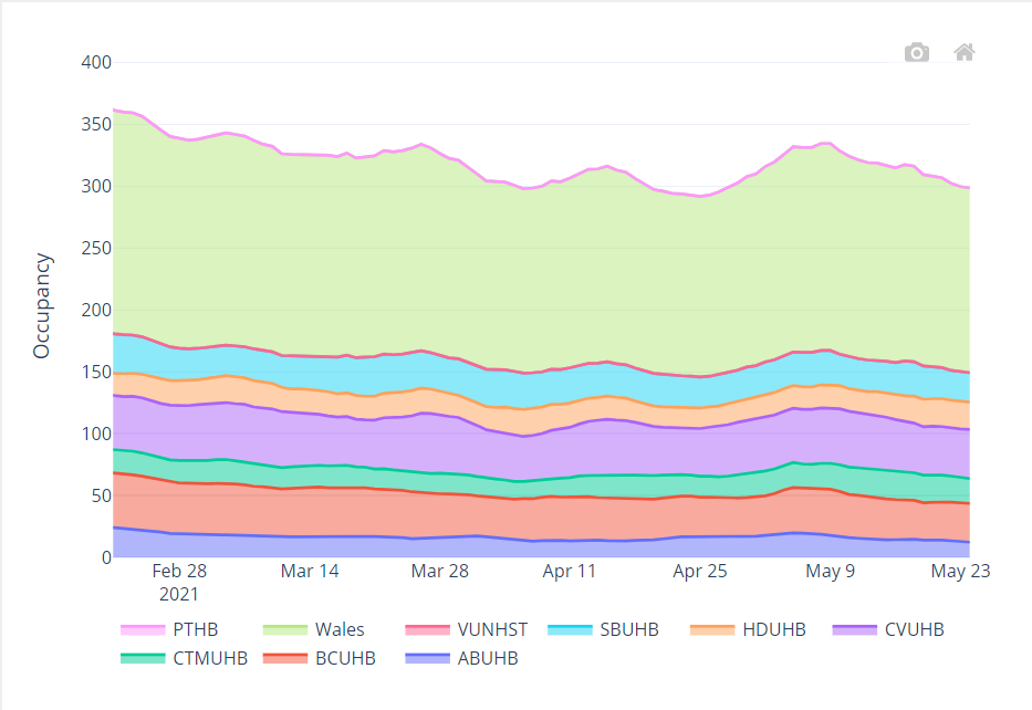 COVID-19 pressure on the NHS has generally stabilised and is now similar to the lowest levels since reporting began. As at 26 May 2021, there were 179 COVID-19 related patients (Suspected, Confirmed and Recovering) occupying a hospital bed. This compares to 171 (8 more occupied beds) on 19 May 2021. Confirmed patients accounted for 8 of the total occupied beds, and are at similar levels to early September 2020.
