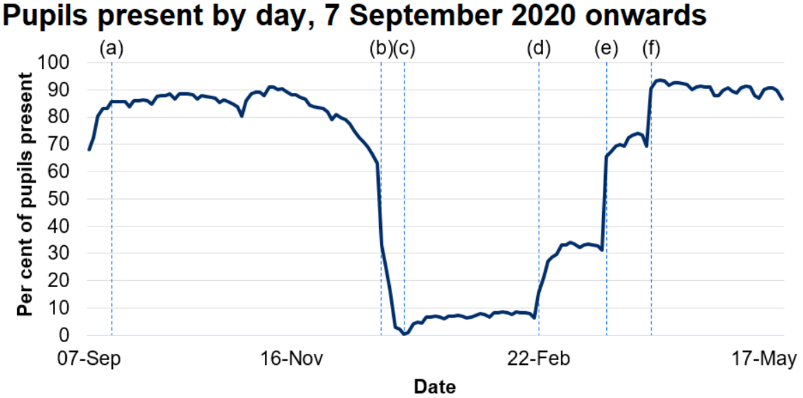 An average of 90% of all pupils were present in school over the week of 17 May to 21 May. This information is provisional and will be revised on 9 June. Source: Stats Wales.