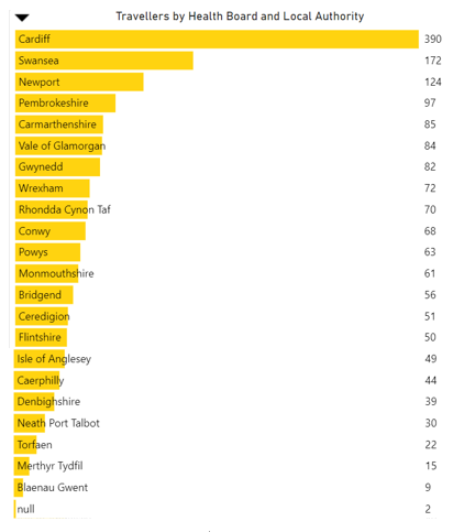 | Local Authority | Number | % of All Wales Total | Case Incidence per 100,000 | Incidence threshold reached | Change from previous week |