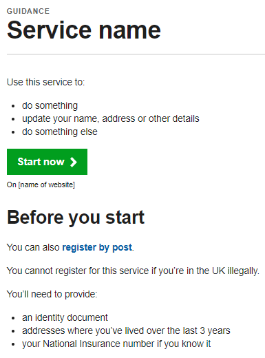 A start page is a guide page built to a specific structure, to provide a starting point to a GOV.WALES service or a GOV.WALES tool. The start page can be a single page on its own or a page within a multi-page guide. Consider a multi-page guide if users need more context to use the service or tool. For example, before a user applies for the Childcare Offer they need to understand: