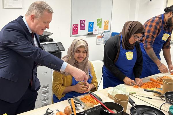 Jeremy Miles visited a ‘Cook Stars’ session taking place at the school where parents and carers are learning how to cook low-cost meals.