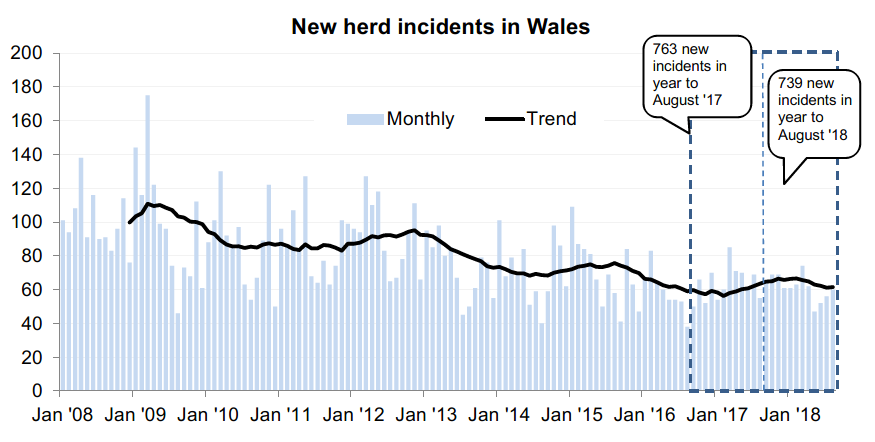 - In the 12 months to August 2018, there were 739 new herd incidents reported in Wales.