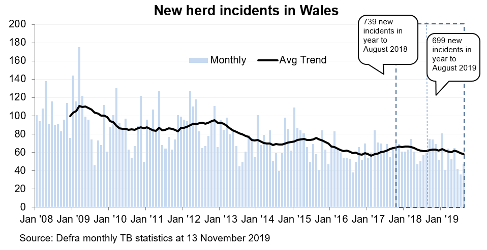 - In the 12 months to August 2019, there were 699 new herd incidents reported in Wales.