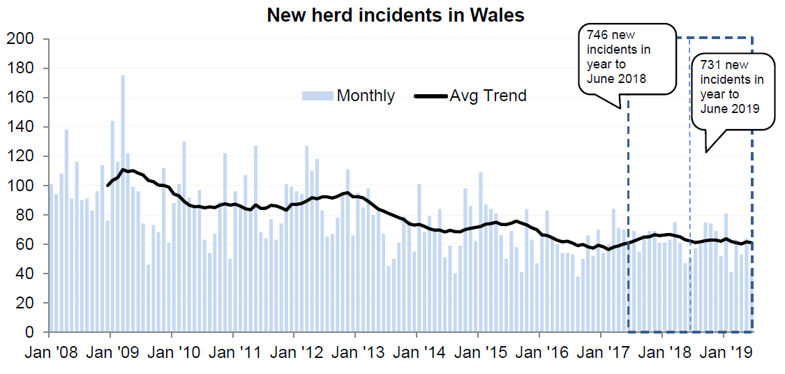 - In the 12 months to June 2019 there were 731 new herd incidents reported in Wales.