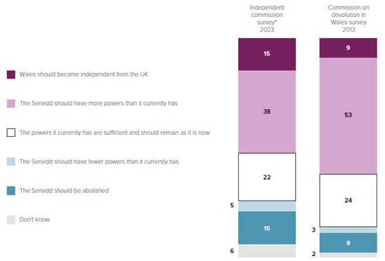 Graph from the 2023 State of the Union (Gathering public views on potential options for Wales’s constitutional future: Quantitative survey findings summary, Beaufort Research, 2023)