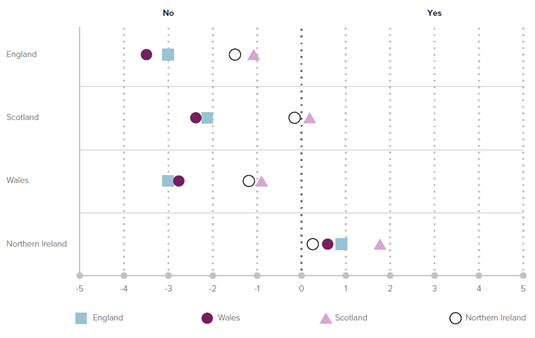 Graph from the 2023 State of the Union research (Henderson, A., Wyn Jones, R., 2023, Public attitudes towards the constitutional future of the UK: Analysis from the 2023 State of the Union Survey, Wales Governance Centre and University of Edinburgh).