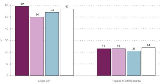 We have noted that support in Wales for abolition of the Senedd has risen to 15% from around 9% a decade ago (Gathering public views on potential options for Wales’s constitutional future: Quantitative survey findings summary, Beaufort Research, 2023). There is limited support for devolution to the regions of England, though this seems to be driven by lack of interest rather than hostility. However, there is solid support for the idea that UK and devolved governments should have their authority respected, and act within their boundaries.