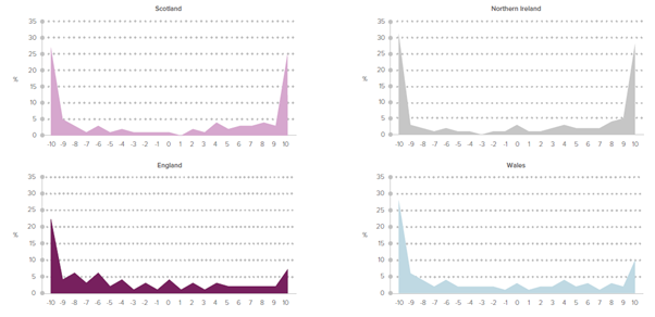 Distribution of support for independence/reunification in own territory. Questions: Scotland - On a scale of -10 to +10, where -10 is Definitely No’ and +10 is ‘Definitely Yes’, do you think that Scotland should become an independent country? Northern Ireland – And using a slightly different scale what about Northern Ireland? If -10 Is Definitely remain in a union with the United Kingdom and +10 is Definitely should become part of a united Ireland, what do you think should happen in Northern Ireland? England – And using the same scale, what about England? Do you think that England should become an independent country? Wales – And using the same scale, what about Wales? Do you think that Wales should become an independent country.