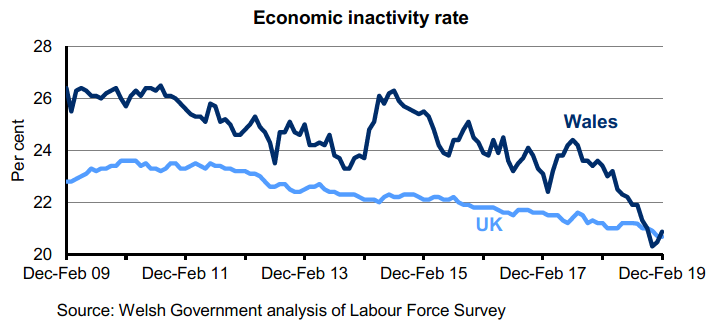 Wales: The economic inactivity rate in Wales was 20.9%. This is unchanged on the quarter and 2.4 percentage points down on the year.