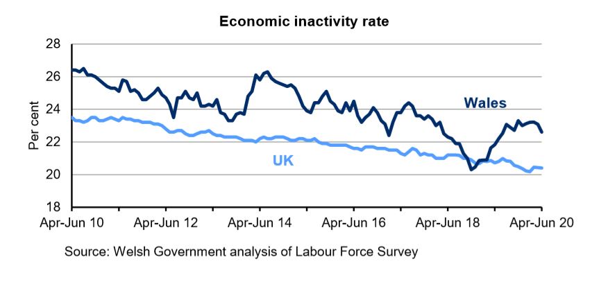 Wales: The economic inactivity rate in Wales was 22.6%. This is 0.6 percentage points down on the quarter and 0.8 percentage points up on the year.