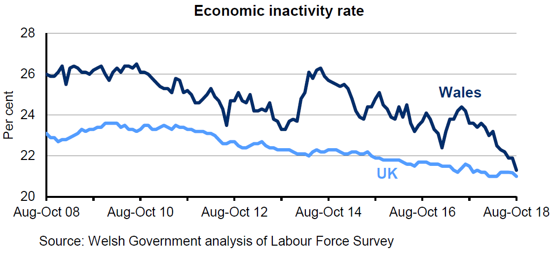 Wales: The economic inactivity rate in Wales was 21.3%. This is 0.9 percentage points down on the quarter and 2.3 percentage points down on the year.