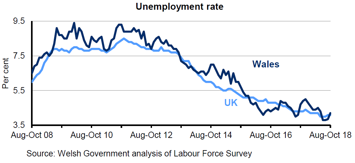 Wales: The unemployment rate in Wales was 4.2%. This is 0.4 percentage points up on the quarter and 0.5 percentage points down on the year.