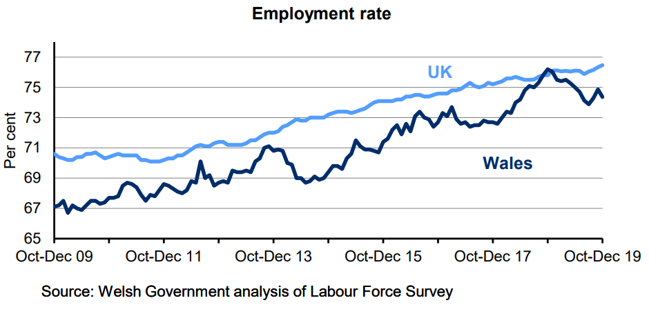 Wales: The employment rate in Wales was 74.4%. This is 0.5 percentage points up on the quarter and 1.9 percentage points down on the year.