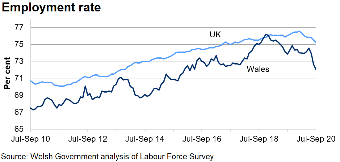 Wales: The employment rate in Wales was 72.1%. This is 2.5 percentage points down on the quarter and 1.8 percentage points down on the year. This is the largest quarterly decrease of the employment rate in Wales since records began in 1992