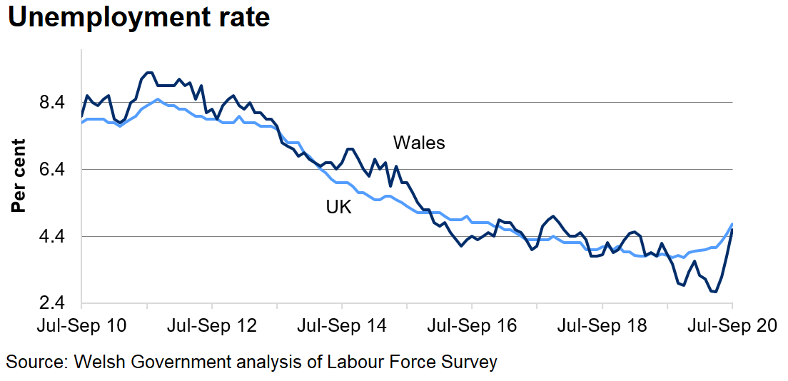 Wales: The unemployment rate in Wales was 4.6%. This is 1.9 percentage points up on the quarter and 0.8 percentage points up on the year. This is the largest quarterly increase of the unemployment rate in Wales since records began in 1992