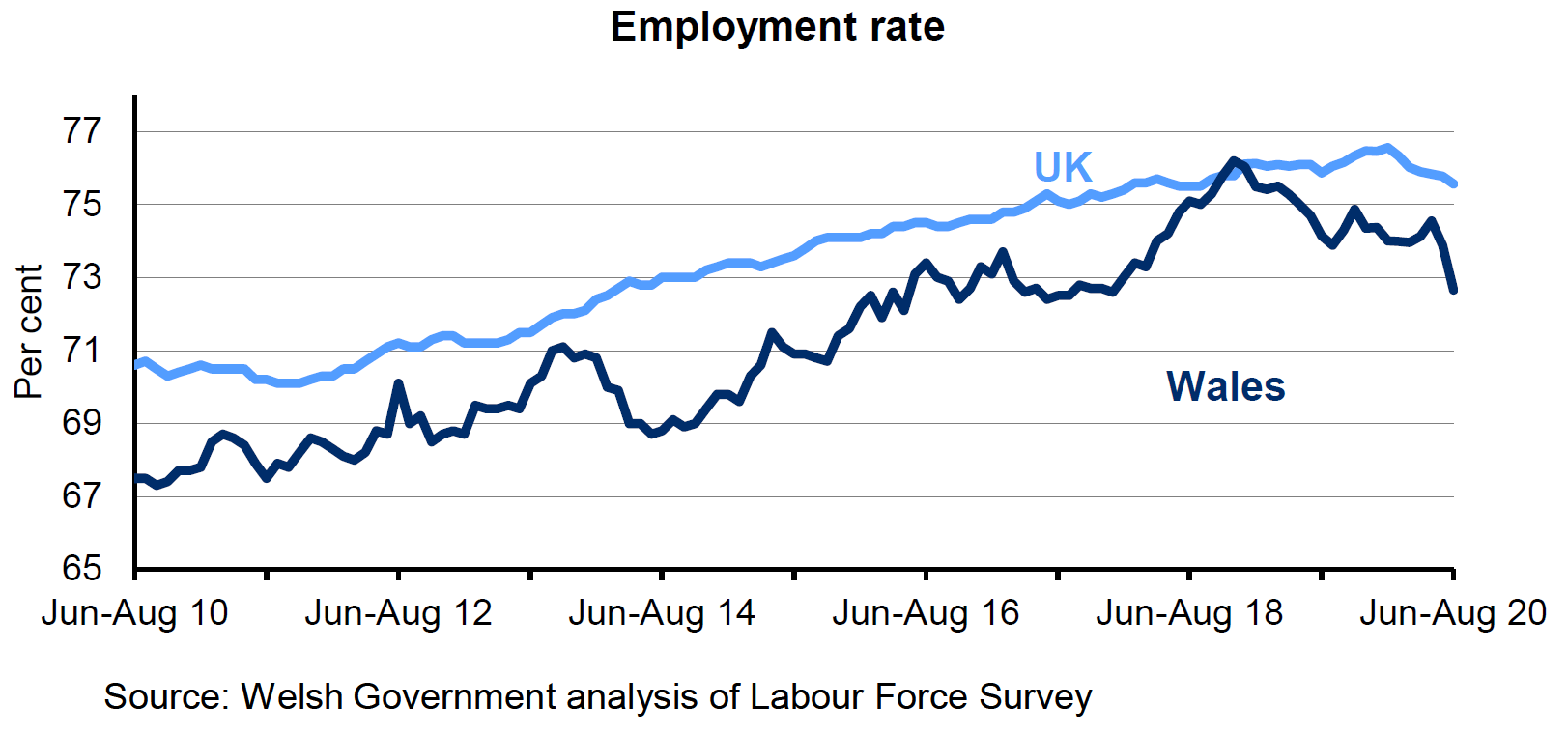Wales: The employment rate in Wales was 72.7%. This is 1.5 percentage points down on the quarter and 1.5 percentage points down on the year.