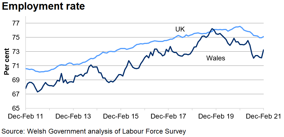 The employment rate in Wales was 73.2%. This is 0.8 percentage points up on the quarter and 0.8 percentage points down on the year.