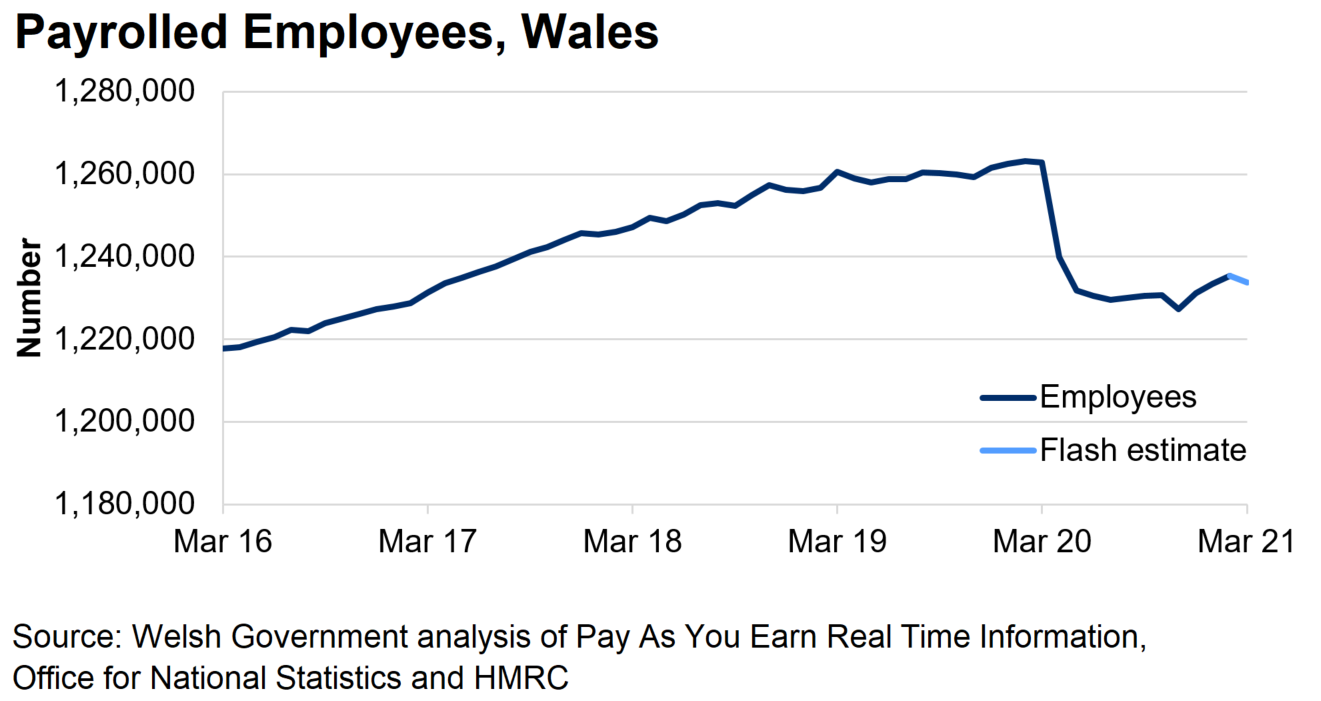 Early estimates for March 2021 indicate that the number of paid employees in Wales was 1.23 million. This was a decrease of 29,000 (2.3%) on February 2020, but a slight increase of 6,000 (0.5%) compared with the lowest point in November 2020.