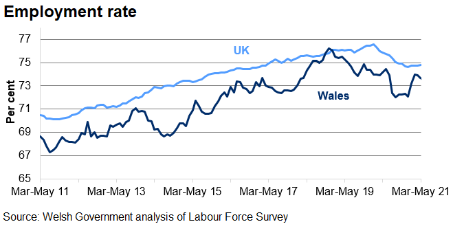 The employment rate in Wales was 73.6%. This is 0.4 percentage points up on the quarter and 0.6 percentage points down on the year.