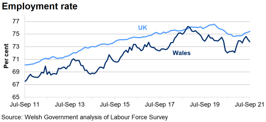 The employment rate in Wales was 73.8%. This is 0.4 percentage points down on the quarter and 1.8 percentage points up on the year. This is the largest annual increase since February to April 2019.