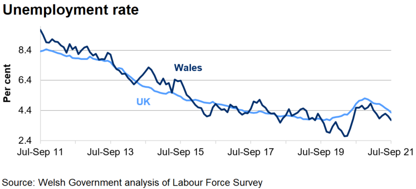 The unemployment rate in Wales was 3.8%. This is 0.3 percentage points down on the quarter and 0.8 percentage points down on the year. This is the lowest unemployment rate since May to July 2020.