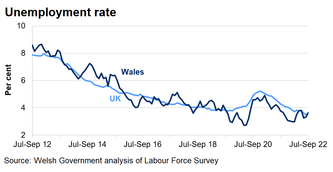 The unemployment rate in Wales was 3.7%. This is down slightly on the quarter and down slightly on the year.