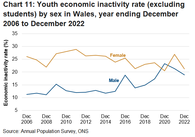 The youth economic inactivity rate for males in the year ending December 2022 was 18.9%, a decrease of 2.4 percentage points compared to the previous year and the rate for females was 21.2%, a decrease of 5.7 percentage points. This series can be volatile and short-term changes should be treated with caution.