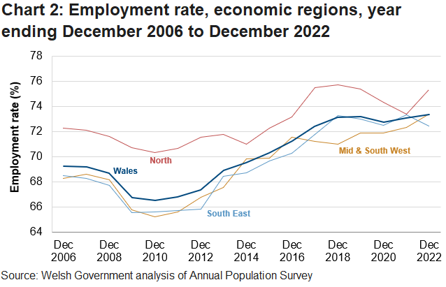 The employment rate in North Wales was 75.3%, an increase of 1.9 percentage points over the year, in Mid and South West Wales the rate was 73.3%, an increase of 1.0 percentage points and in South East Wales the rate was 72.4% a decrease of 0.9 percentage points. North Wales continued to have the highest employment rate of the three Welsh economic regions (Differences calculated using unrounded figures).
