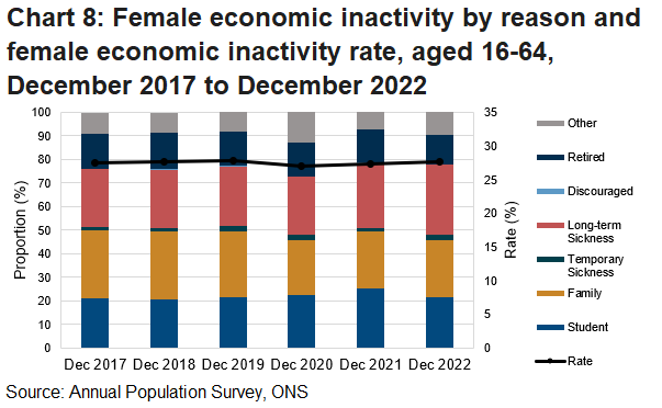 Historically, the most common reason for economic inactivity for females in Wales has been looking after family/home, although the overall trend has been decreasing over time. During 2020, this proportion dropped suddenly, which could be due to the coronavirus (COVID-19) pandemic, as an opposite trend can be observed for those giving 'other' reasons. Since 2020, the proportion of females economically inactive whilst looking after family/home has started to increase again.