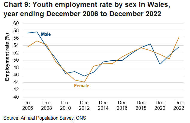 The youth employment rate in Wales in the year ending December 2022 was 54.9%, up 4.0 percentage points compared to the previous year. The UK rate was 53.7%, up 2.4 percentage points compared to the previous year.