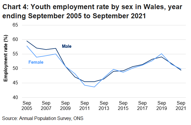 The youth employment rate in Wales was 49.6%, down 2.1 percentage points compared to the previous year. The UK rate was 50.5%, down 2.5 percentage points compared to the previous year.