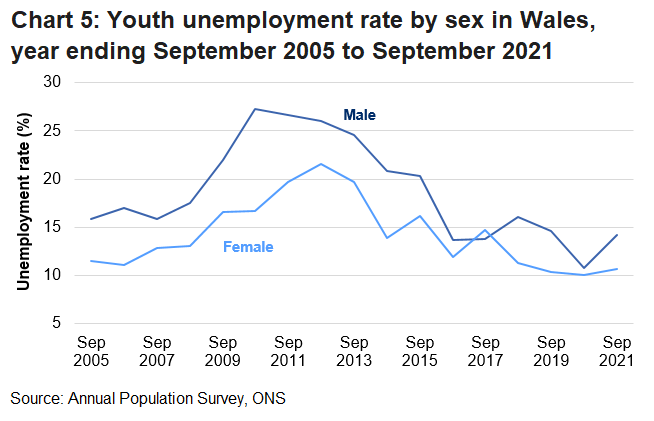 The youth unemployment rate for males was higher than females in Wales at 14.3% and 10.7% respectively.