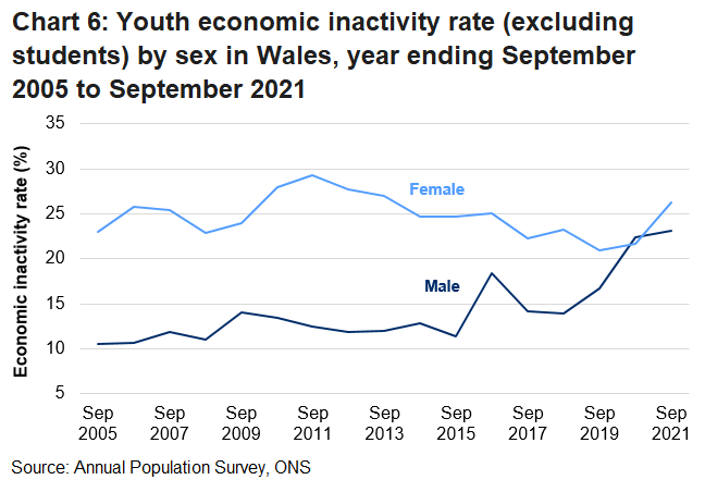 The youth economic inactivity rate in Wales was 24.5%, up 2.5 percentage points compared to the previous year. The UK rate was 17.8%, up 0.1 percentage points over the year.