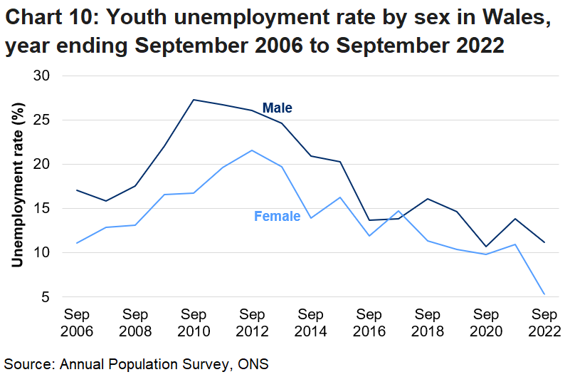 The youth unemployment rate in Wales in the year ending September 2022 was 8.4%, down 4.0 percentage points compared the previous year. The equivalent UK rate was 10.4%, down 2.9 percentage points. The Wales figure for the youth unemployment rate in the year ending September 2022 was the lowest since APS records began in 1996.